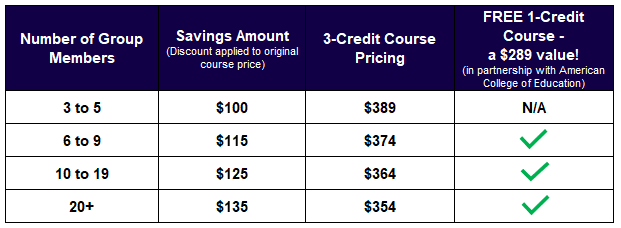 - Groups of six or more earn a free 1-credit course offered in partnership with American College of Education.